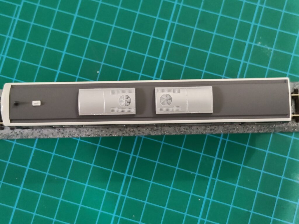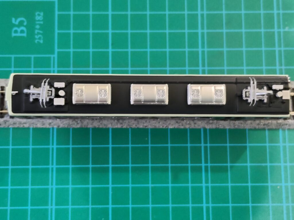 グリーンマックスとは異なり、乗務員はしごやドアコック表記もしっかりしているのですが、屋根上の色はグレーになっているので、今後屋根を取り外してジャーマングレー塗装を行う予定です。Nゲージは屋根上が目立つ大きさですので自分のできる範囲で加工していこうと思います。